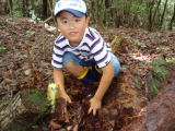 | 岐阜県からお越しの宮嶋様 昆虫大好きなこうたくん、ムシことをいっぱい話しながら森の探検をしました。 木をゆらしたり、けったりしてコクワガタのオスをゲット!小川では、アメンボやカエルやザリガニにも出会えました。 |